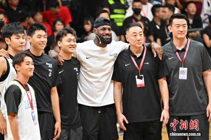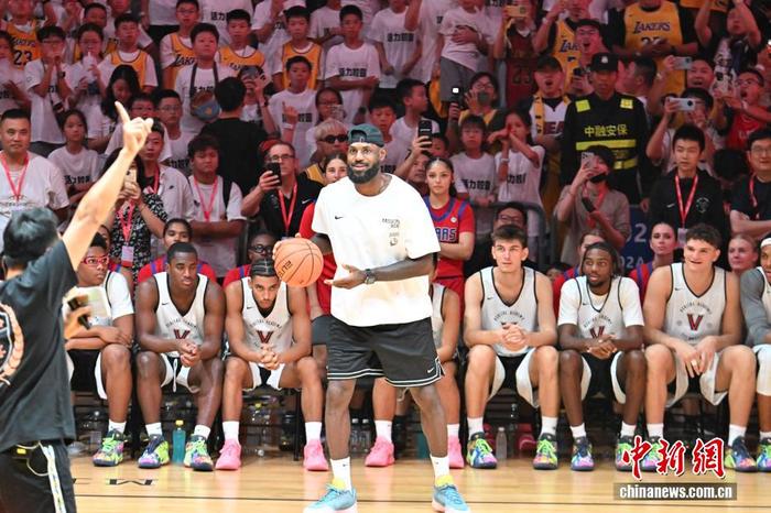 9月5日晚,NBA球员勒布朗·詹姆斯中国行活动在四川成都高新体育中心举行。活动中,勒布朗·詹姆斯观看了篮球比赛并与中国篮球小将进行互动交流。图为勒布朗·詹姆斯在比赛交流中。中新社记者 张浪 摄
