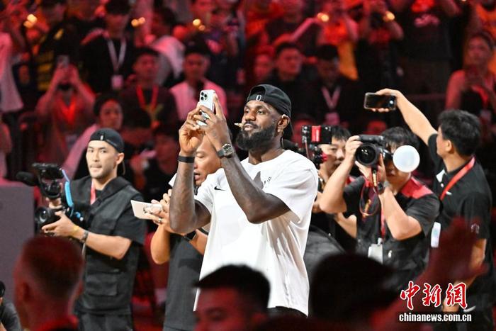 9月5日晚,NBA球员勒布朗·詹姆斯中国行活动在四川成都高新体育中心举行。活动中,勒布朗·詹姆斯观看了篮球比赛并与中国篮球小将进行互动交流。图为勒布朗·詹姆斯在交流活动中。中新社记者 张浪 摄