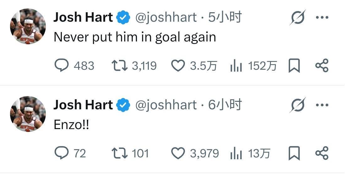 纽约尼克斯后卫约什-哈特是一名切尔西球迷,他曾多次出现在现场观看切尔西的比赛。从社媒动态的发布时间看,约什-哈特应该是观看了切尔西的比赛直播,显然,他被约恩森的表现气坏了,他在社交媒体上写道:“别再让他守门了”。