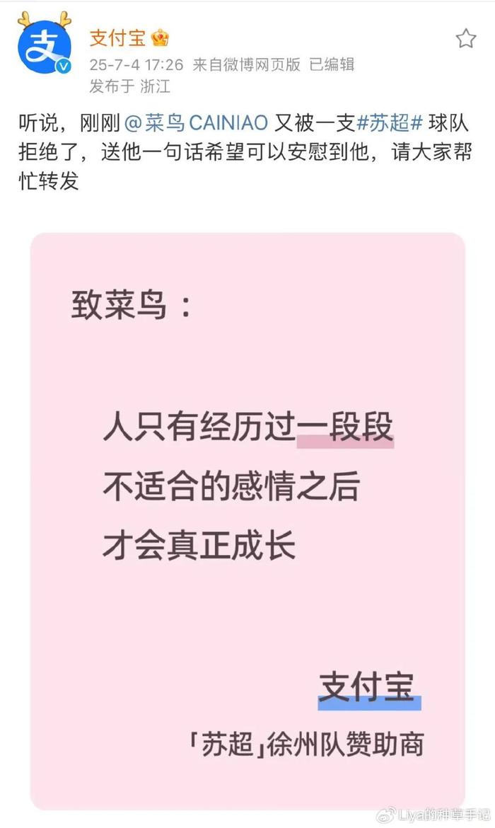 随后支付宝“暖心”安慰菜鸟:“人只有经历过不合适的感情才会成长”,还特意落款“徐州队赞助商”身份。