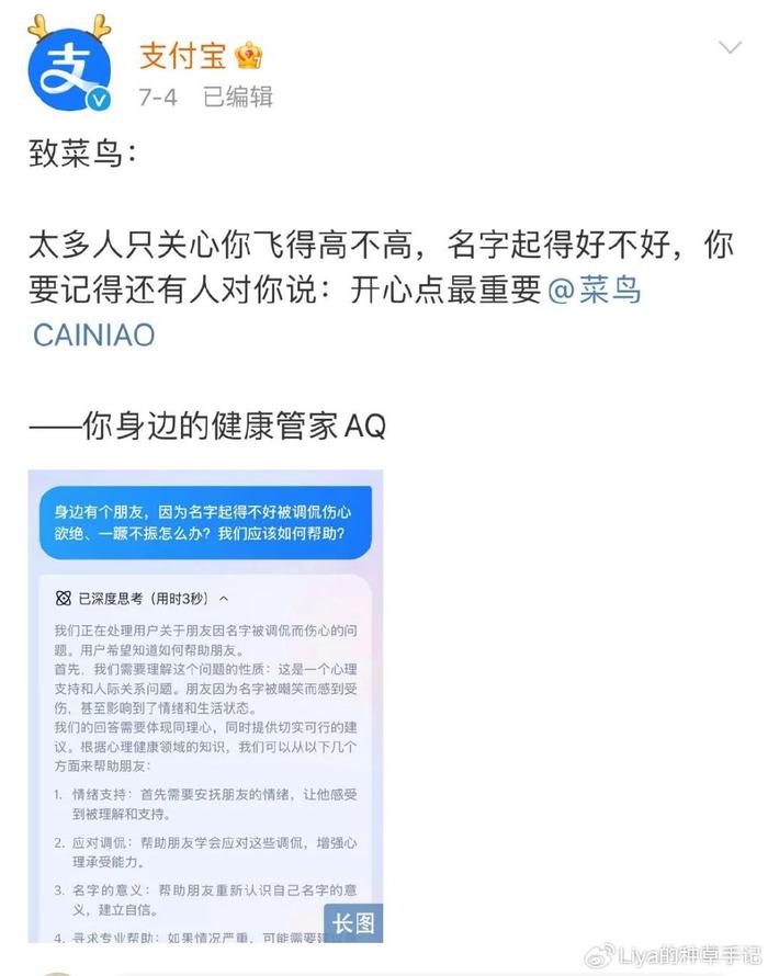 不仅如此,支付宝紧跟热点让AI 生成“安慰因名字难听伤心的好友”话术,哪壶不开提哪壶,简直是熊猫点外卖——笋到家了。